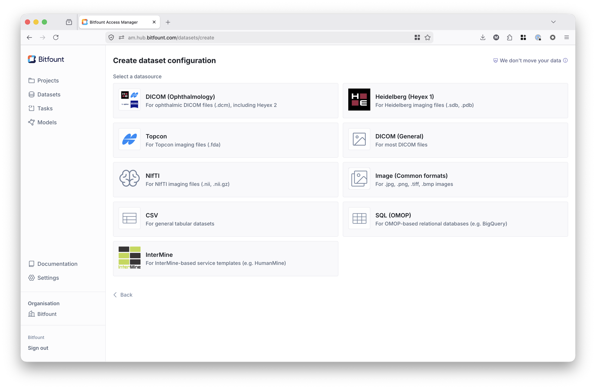 Bitfount datasets can run in containers. You need a dataset configuration and credentials. Follow the steps in Create a dataset in the Bitfount Hub.