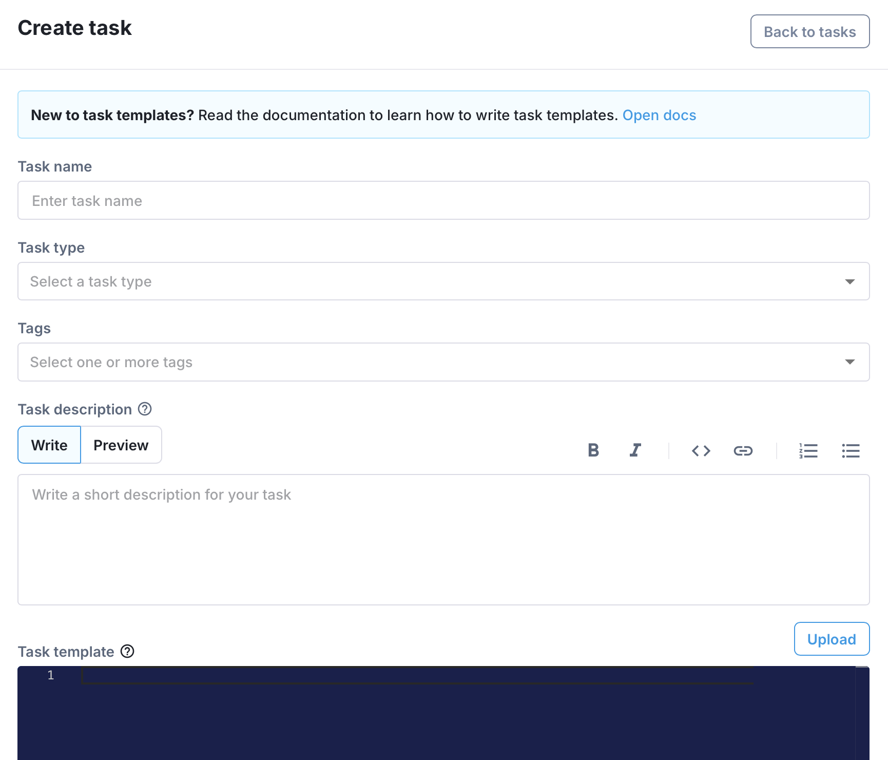 - Either paste or upload the task YAML file you want to upload along with the name, description, type and any tags you want to add.